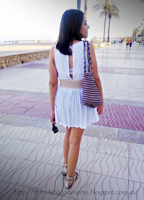 Realmente lo compré para utilizar al ir a la playa, ya que la falda clarea bastante, la parte de arriba es descubierta a la espalda y deja todo a la vista también por delante. Pero yo me dije, ¿cómo voy a dejar este vestido tan bonito para ir a la playa solamente? Así que entré en Bershka en busca de alguna solución, y al final me decidí por uno de estos tops que de tantos apuros nos sacan, al menos a mi.
